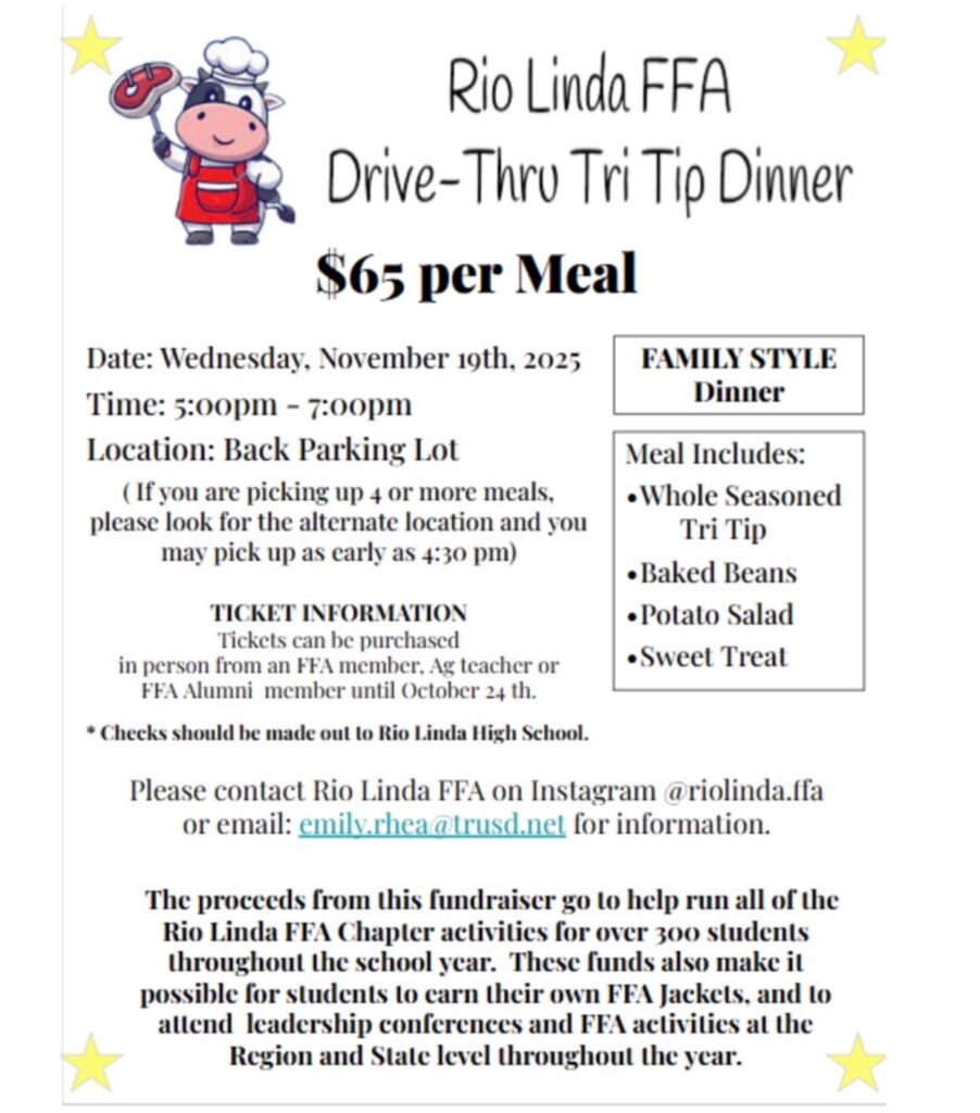 The Rio Linda FFA Chapter is firing up the grill for their annual Drive-Thru Tri Tip Dinner fundraiser! This is a fantastic opportunity to enjoy a delicious, family-style meal and support over 300 local students.