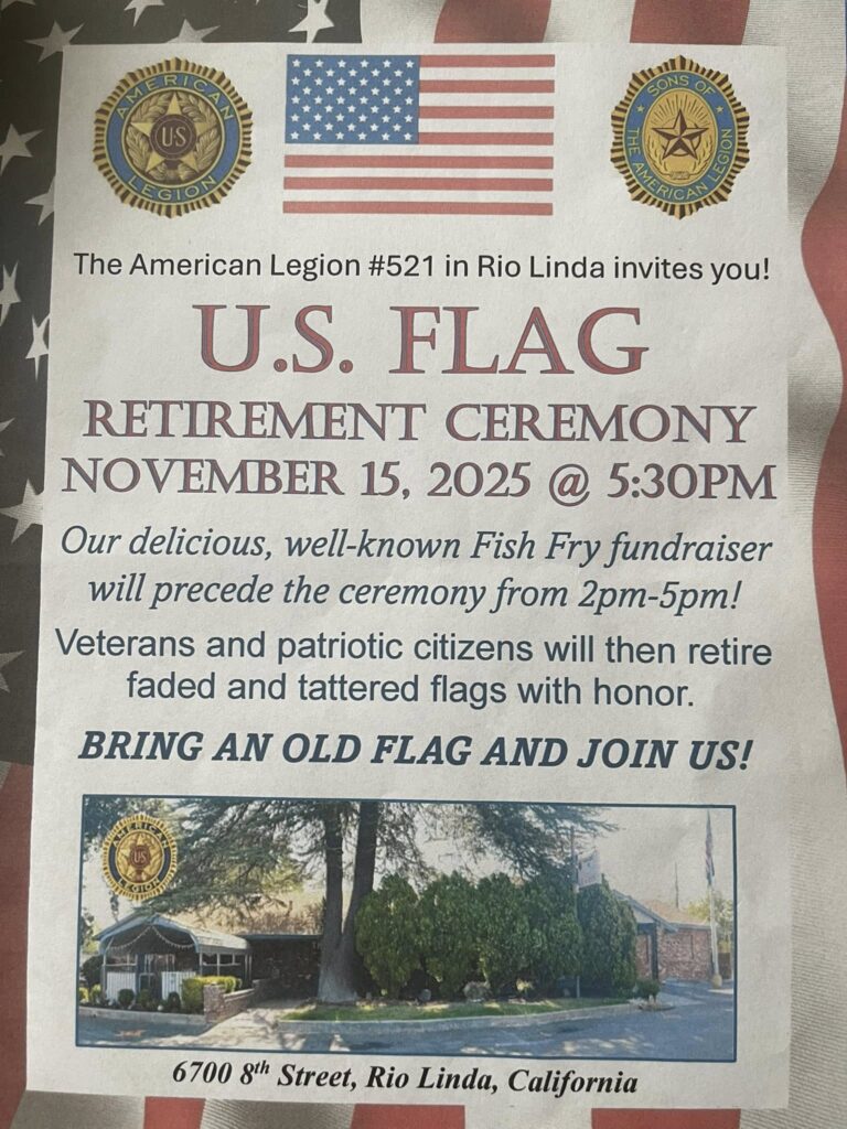 The American Legion Post #521 in Rio Linda invites the community to attend a solemn and respectful U.S. Flag Retirement Ceremony next month.