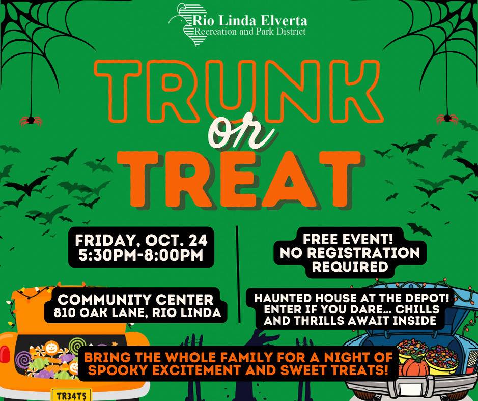 - Trunk or Treat: Held at the Community Center (810 Oak Lane, Rio Linda). Bring your little ghosts and goblins to collect treats from decorated cars.