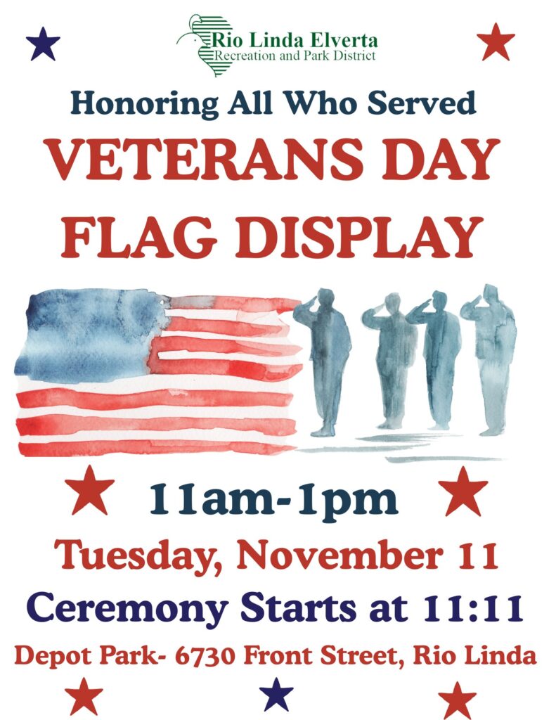 The Rio Linda Elverta Recreation and Parks District invites you to join them tomorrow, Tuesday, November 11th, as we gather to pay tribute to the brave men and women who have served our country.