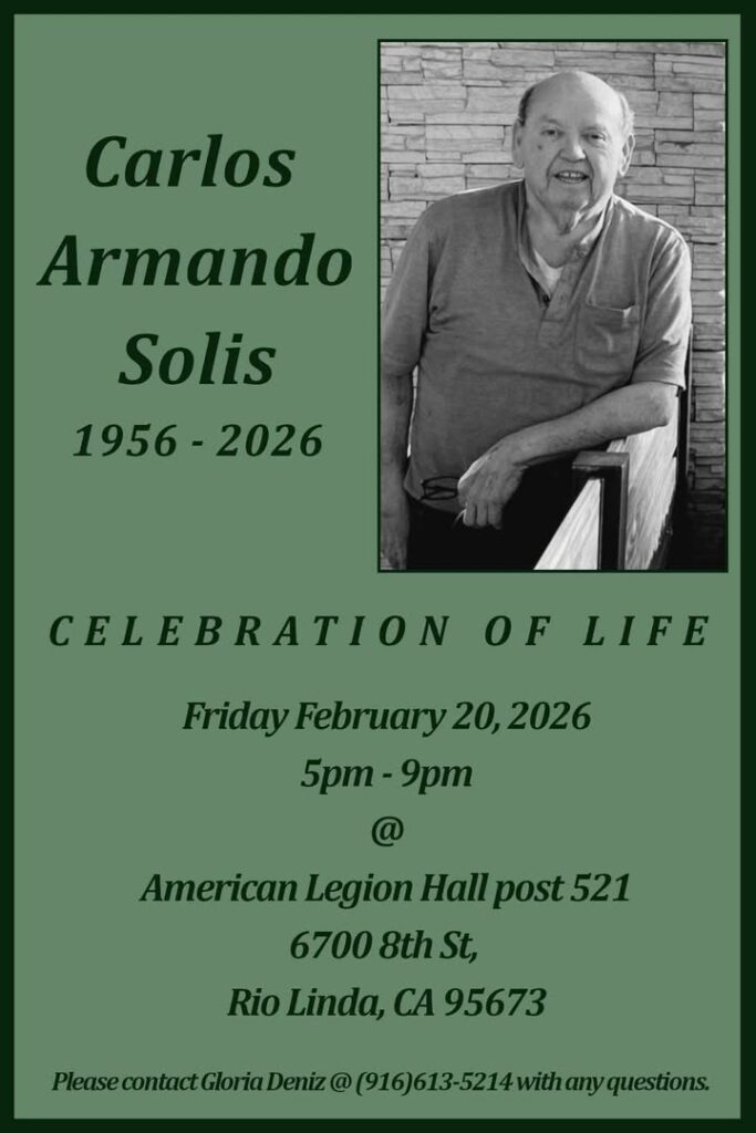 Carlos Armando Solis passed away peacefully at his home in Rio Linda on February 1, 2026, surrounded by the love of his family and friends.