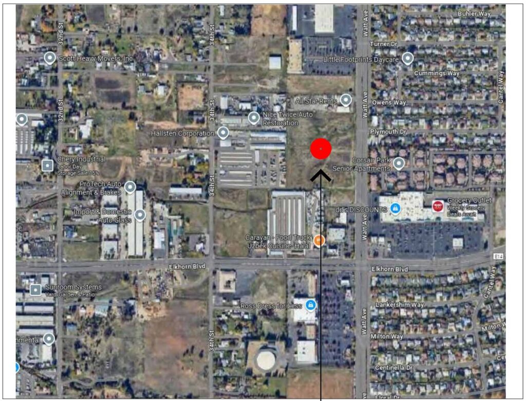 For a local point of reference, this property is on the west side of Watt, just north of the tire shop and cell tower property.